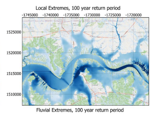 Example of national flood assessment case, where a 100 year return period with local extremes is explored.